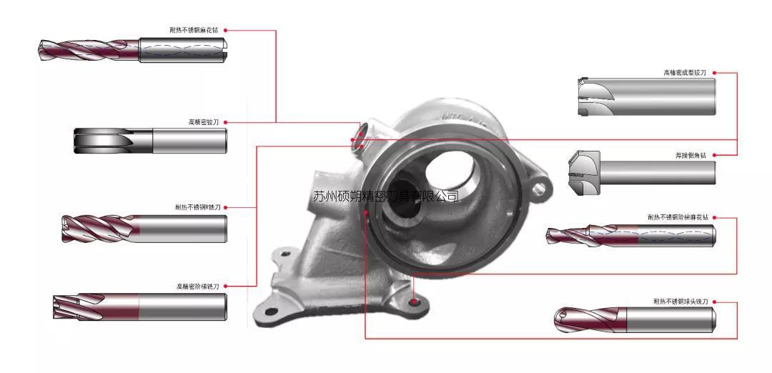 渦輪增壓器部件的制造與加工非常復雜,對制造商提出了高生產(chǎn)率的需求,但同時尤其強調(diào)工藝可靠性;對于1.4849, 1.4848 或 1.4837(德標耐熱不銹鋼)之類的常規(guī)被加工材料而言,SS/碩朔可專業(yè)提供最優(yōu)化的訂制刀具方案;特定的對切削刀具有特別要求的被加工材料提供諸如不同的涂層及適用于其加工特征的相應刀具產(chǎn)品。