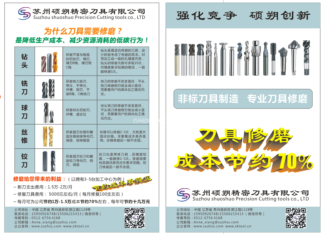 SS碩朔答:提供標(biāo)準(zhǔn)銑刀、鉆頭、絲錐修磨服務(wù)。